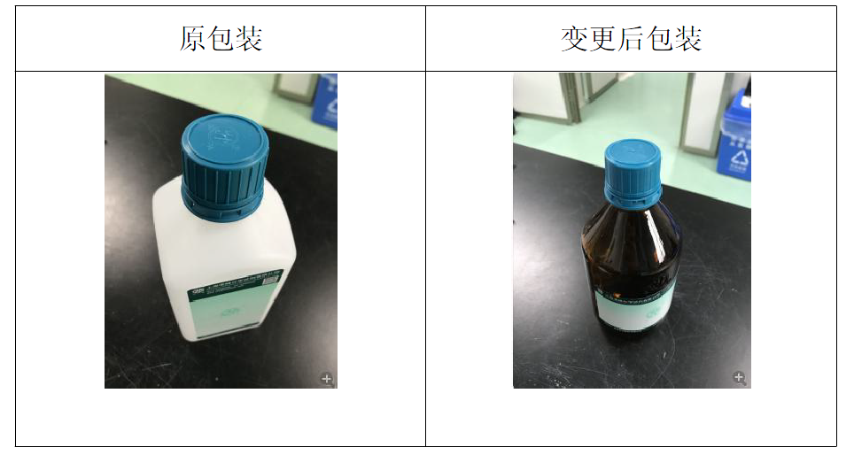 98%甲酸原為500mL 塑(sù)料瓶包裝含透氣蓋,由於甲酸能緩慢透過氣孔逸出導致包裝箱、報(bào)告單腐蝕,影響產品外觀,經綜(zōng)合考慮,變更為500mL 棕色玻璃(lí)瓶包裝(zhuāng)(含內塞)。